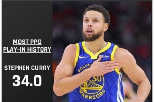 在NBA历史上,至少打过2次附加赛的球员里,库里场均34分是历史最高的。