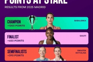 WTA马德里站保分情况:萨巴1000分,高芙650分,斯瓦泰克390分