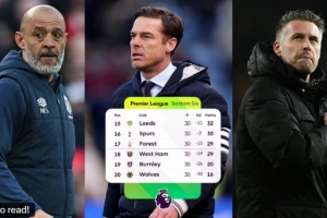 本轮英超在积分榜后6位的球队中,有5队都拿到1分(狼队还未赛),其中利兹联0-0战平水晶宫,诺丁汉森林0-0战平富勒姆,西汉姆1-1战平曼城,伯恩利0-0战平伯恩茅斯。